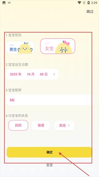 填写宝宝的性别、出生日期(格式为2026年-10月-08日)、昵称(例如bb)以及您与宝宝的关系后,点击“确定”按钮即可完成信息设置。
