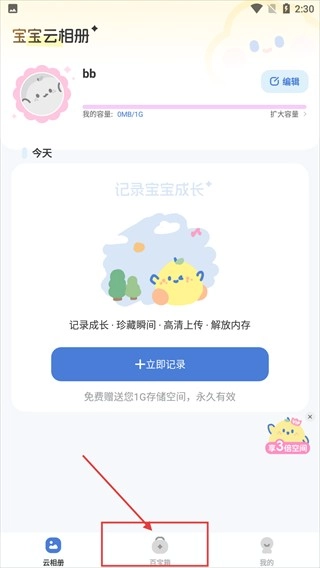 进入【宝宝云相册】页面后,您可以点击【立即记录】按钮来记录宝宝的成长点滴,同时也能查看云相册的容量等相关信息。