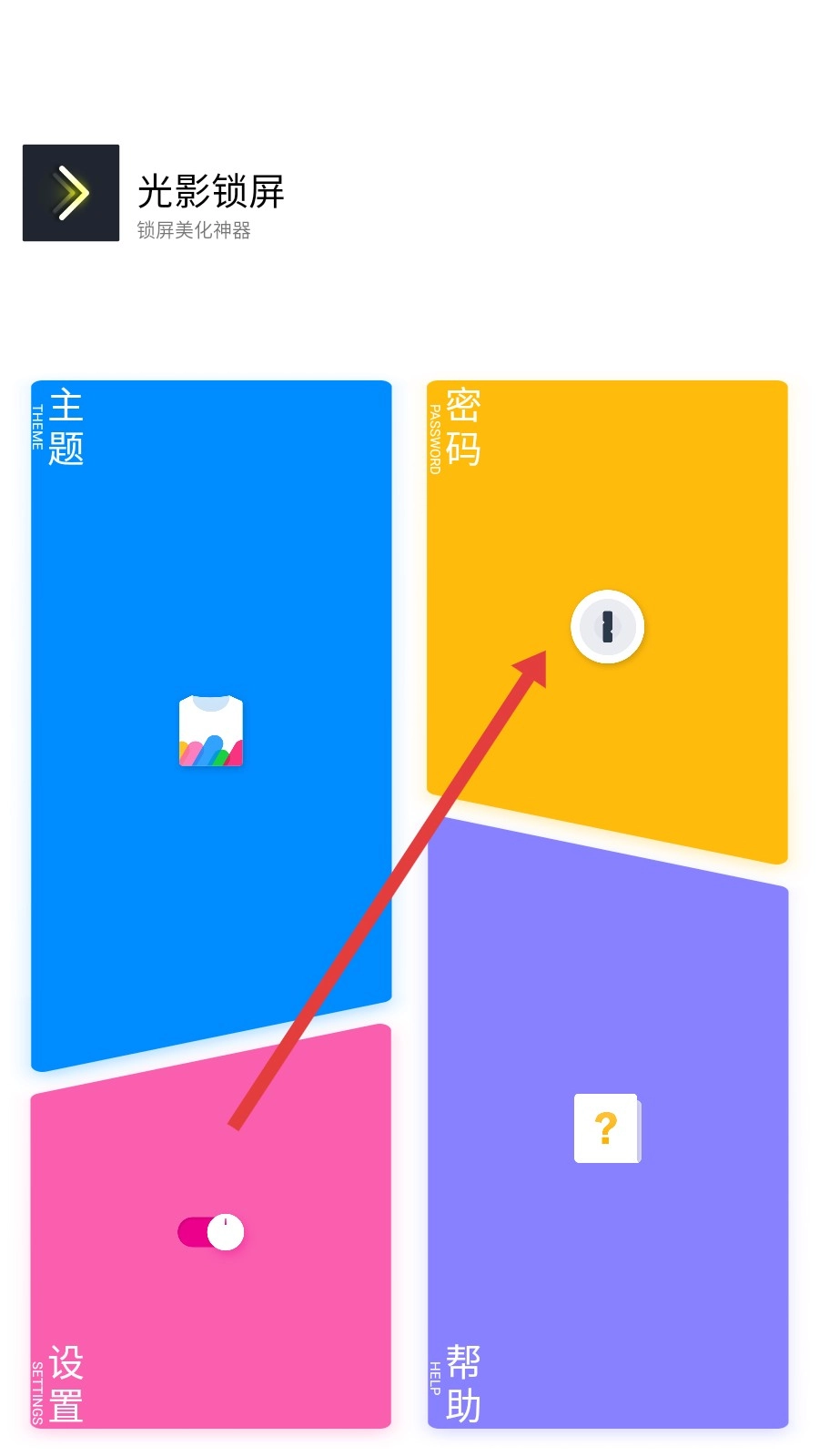打开【光影锁屏】应用,找到并点击黄色的【密码】板块,即可进入密码设置界面。