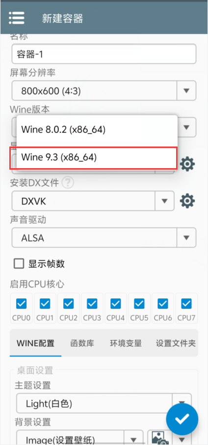 新建一个容器,wine系统下拉选择‘Wine9.3(x86_64)