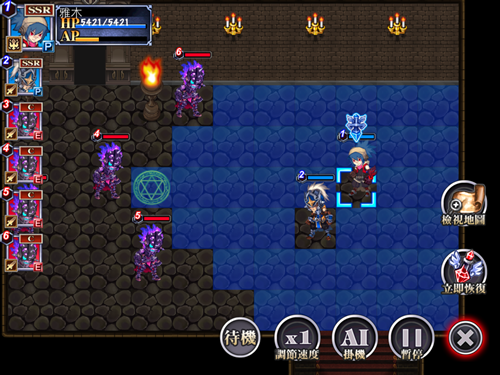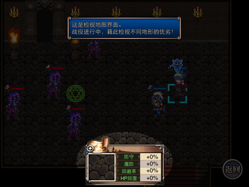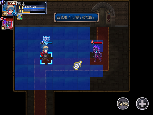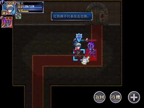 蓝色格子代表行动范围,红色格子代表攻击范围。返回是重置上一次操作。移动到怪物旁边一格后,即可发动对怪物的攻击(近战角色)。