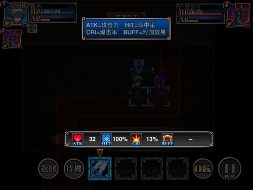 攻击有4种元素:ATK=攻击力、HIT=命中率、CRI=爆击率、BUFF=附加效果。点选屏幕下方技能栏并点击【OK】即可发动攻击。