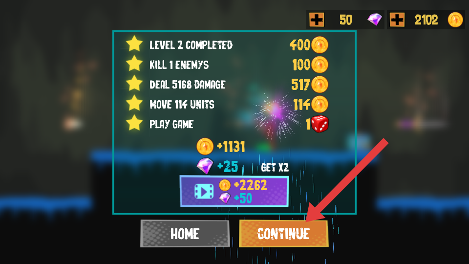 4、成功完成关卡后,获取金币和钻石奖励,点击【CONTINUE】可进入下一关。
