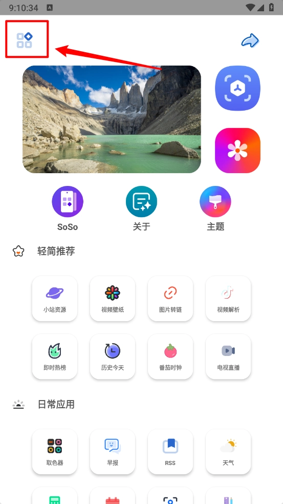 打开轻简工具,进入主页点击左上角图标,如图。