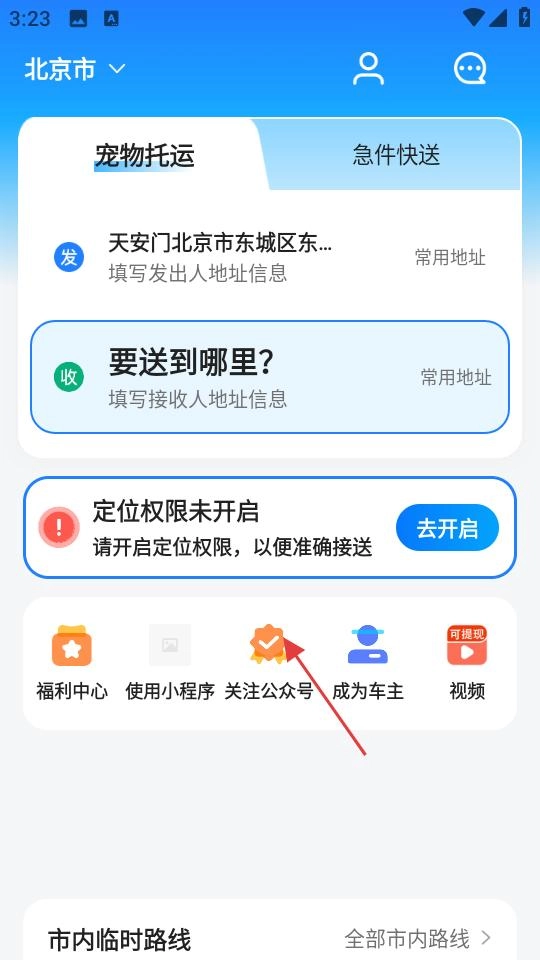 登录后进入宠物托运页面,依次填写发件和收件地址,若定位权限未开启,会收到提示,还可点击关注公众号等,完善托运基础信息。