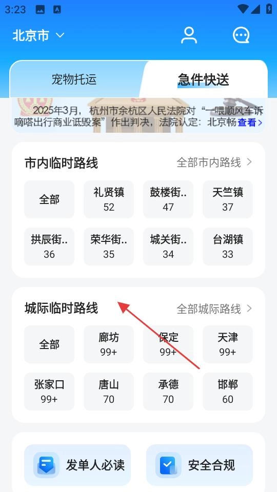 切换到急件快送页面,查看市内及城际的临时路线,像选择礼贤镇、廊坊这类路线点,了解发单人必读以及安全合规的相关内容,进而确定运输路线。