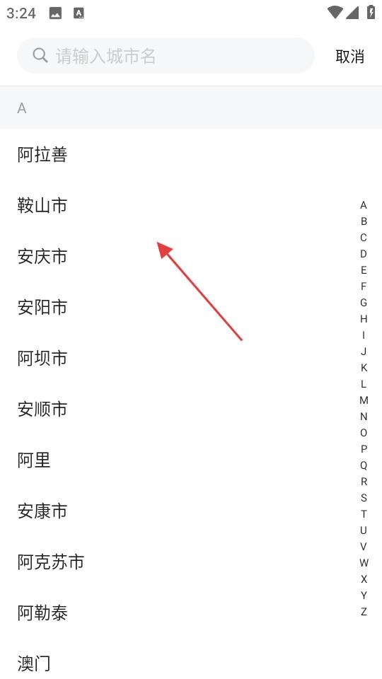 进入城市选择界面后,能够借助搜索功能或者字母索引来选定城市,确定物流托运所涉及的城市,从而推进物流托运流程的开展。