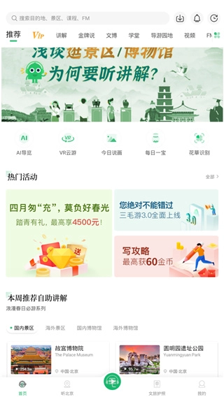 打开软件后,在推荐页面既能使用AI导览、VR云游、今日说画、每日一宝、花草识别等特色功能,也可以浏览国内景区、海外景区、国内博物馆和海外博物馆的相关内容。