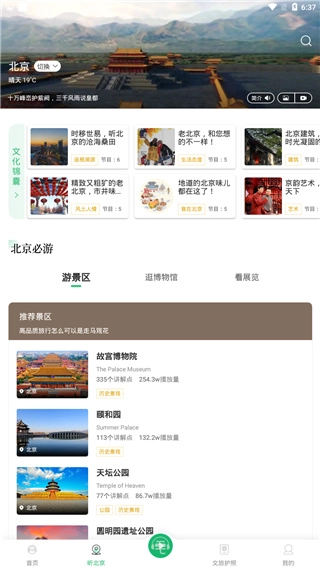 进入“听北京”页面,就能查看北京必去的旅游景区、博物馆以及各类展览。