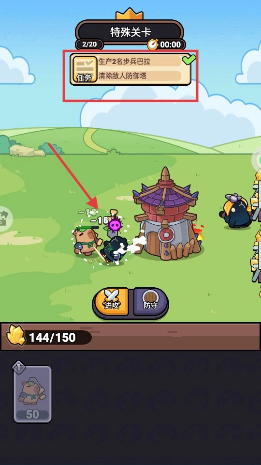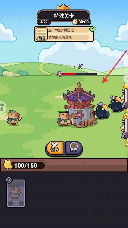 当拥有充足资源时,点击【步兵巴拉】卡牌(消耗50资源)进行召唤,以此推进【生产2名步兵巴拉-清除敌方防御塔】的任务。
