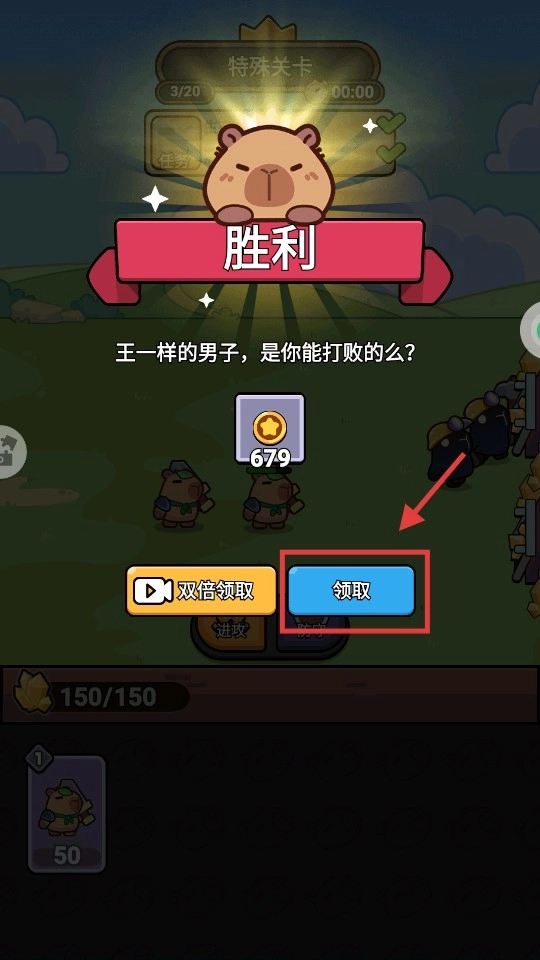 关卡获胜后,点击【领取】按钮就能拿到679金币的奖励,要是想让收益翻倍,也可以通过观看广告来选择【双倍领取】。