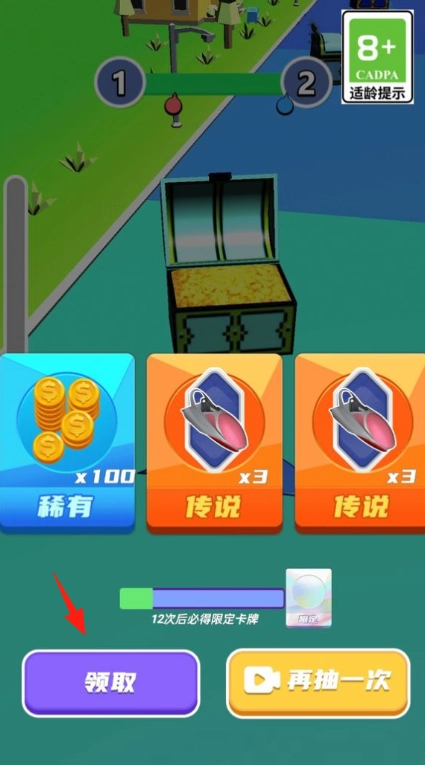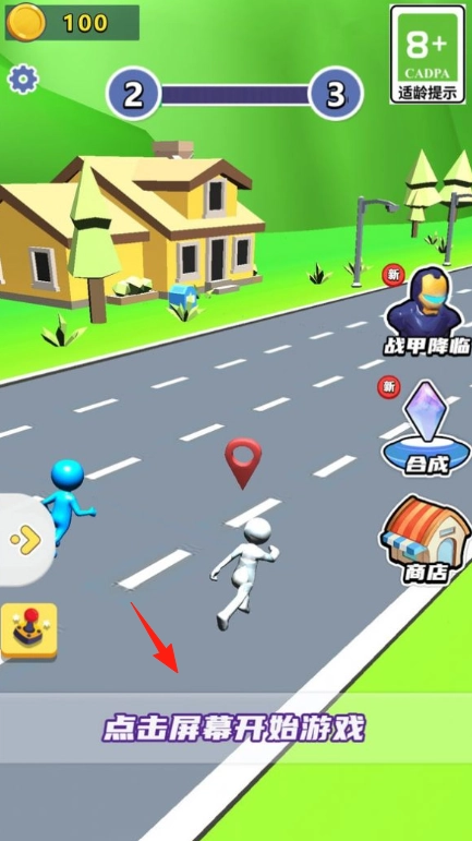 界面上能看到金币数值(100)和8+的适龄提示,还设有“合成”与“商店”功能;抽奖页面包含“稀有”“传说”等级的奖励,通过积累进度可以解锁新的英雄和载具。