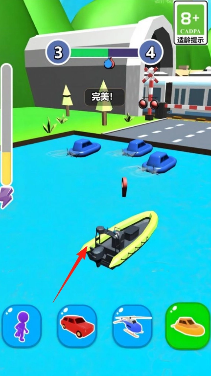 场景与模式包含街道(房屋、角色追逐)、水域(驾驶橡皮艇)等场景,支持人形、汽车、直升机、船等角色切换,可通过等级2→3→4的升级解锁相关内容。