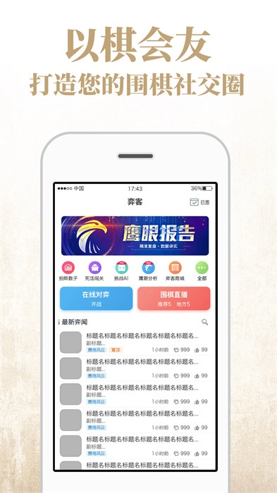 奕客围棋,弈客围棋是一款面向围棋爱好者打造的社交与学习平台,整合了围棋对弈、棋谱分享、赛事直播、教学视频等多元功能,致力于为用户带来全方位且充实的围棋体验。