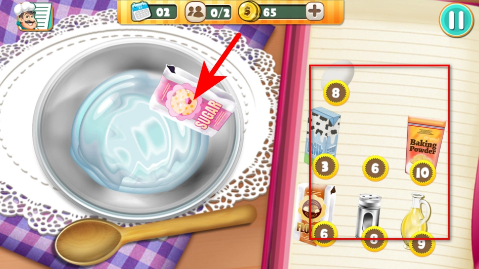 在原料调配界面,点击右侧食材栏里的SUGAR糖,把它添加到容器中以作调配准备。