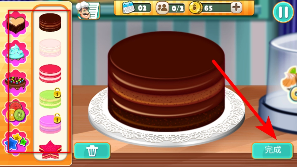 蛋糕烤好后,挑选对应的样式来装饰它,确认装饰效果没问题,就点击完成按钮提交这个订单。