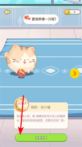 在领养界面浏览完猫咪的昵称和介绍后,点击免费领养按钮就能获得这只猫咪,随后正式进入猫咪养成的核心玩法场景。