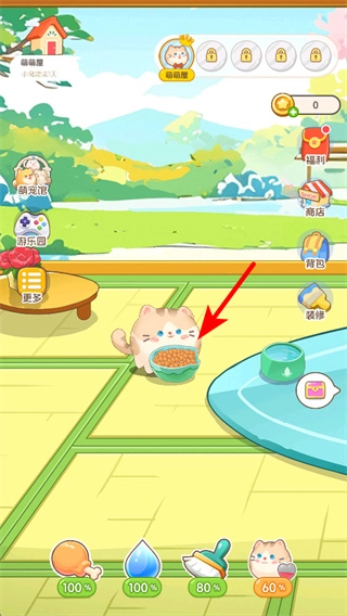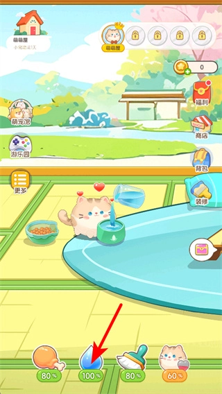 进入猫咪养成界面后,点击底部栏中的水壶道具,就能给猫咪补充水分,以此维持它的各项状态数值;另外,通过和猫咪互动还可以提升彼此的亲密度。