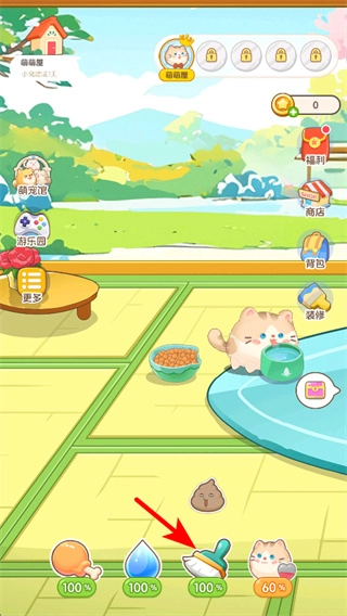 当场景里有粪便这类清洁需求时,点击底部的清洁道具来完成清理,这样能维持猫咪生活环境的干净,让猫咪的养成进度得到推进。