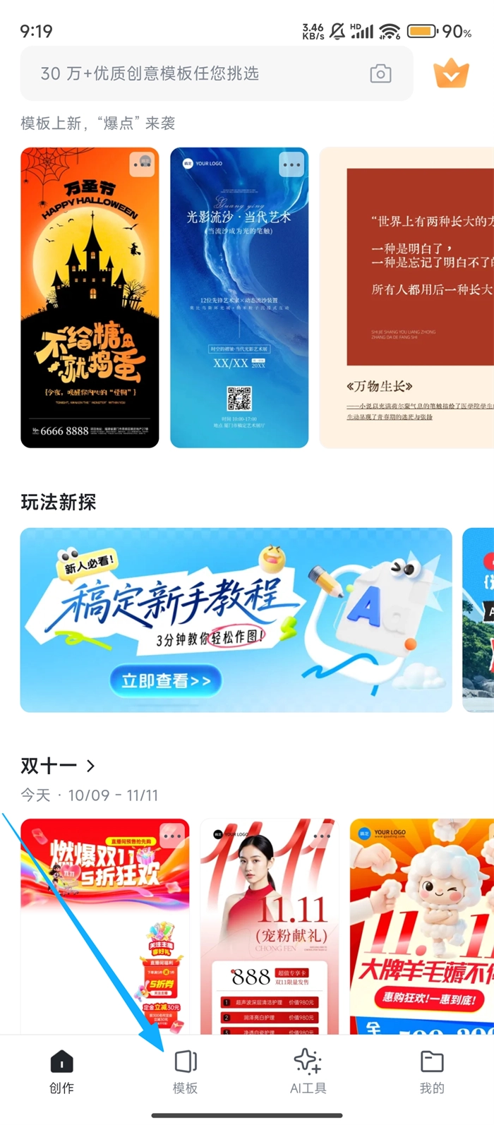 我们打开稿定设计后,点击底部的【模板】按钮,即可进入模板选择页面,正式开启设计之旅。