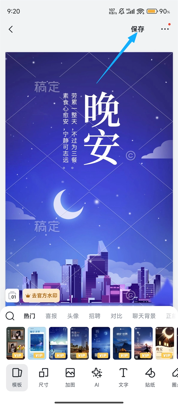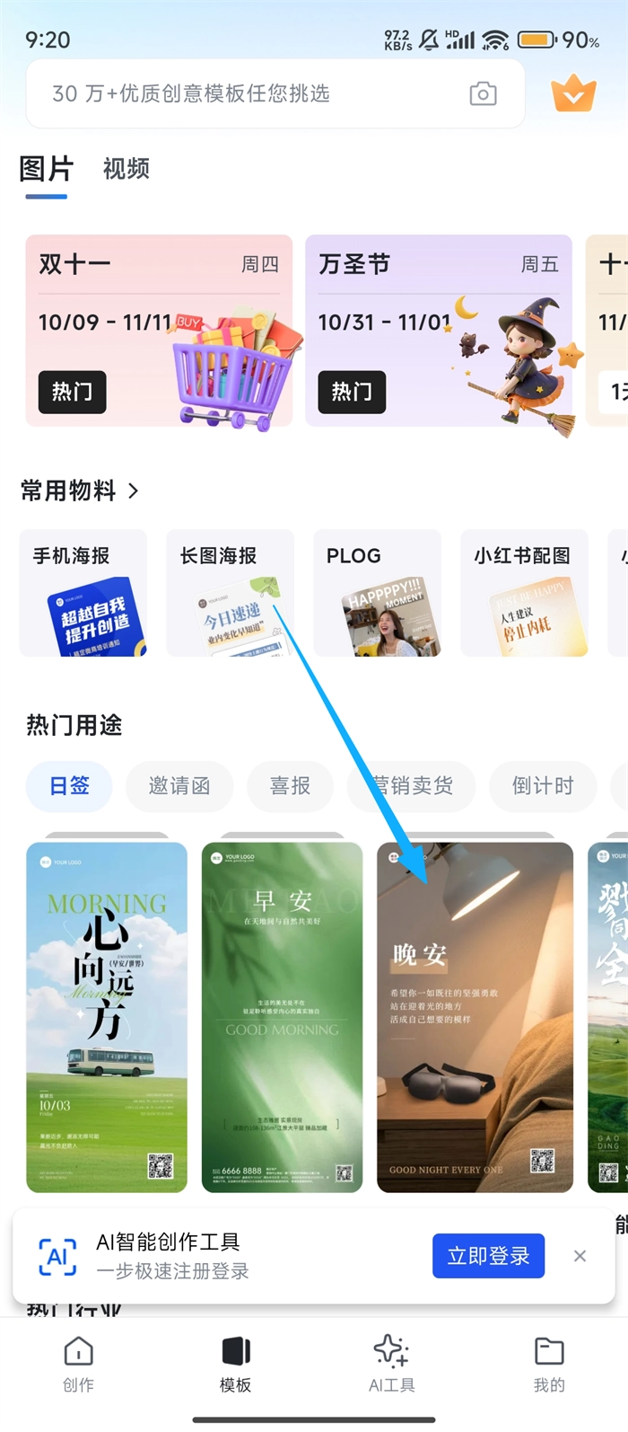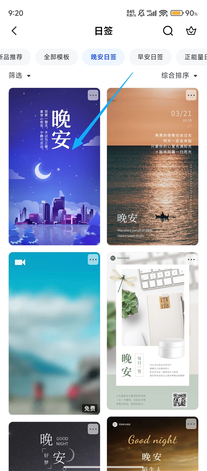 进入日签分类页面后,我们挑选出喜欢的【晚安日签】模板,点击该模板即可进入编辑界面,着手进行个性化的设计工作。