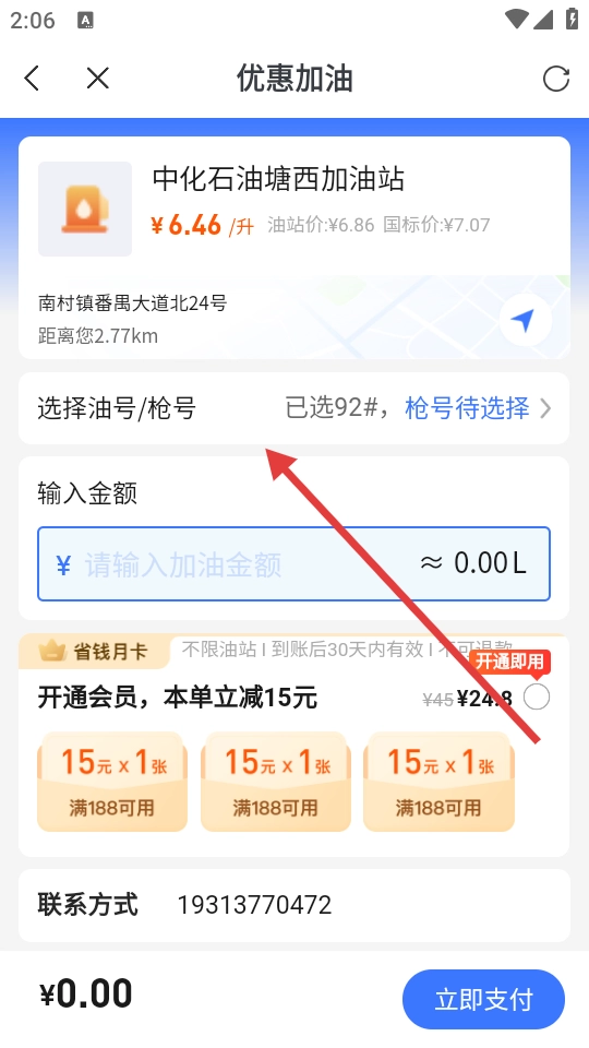 在加油站详情页面,选择油号与枪号,输入加油金额后完成支付,即可下单加油。