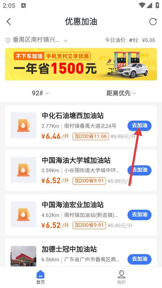 在优惠加油页面选定目标加油站后,点击“去加油”按钮,即可进入该加油站的详情页面。