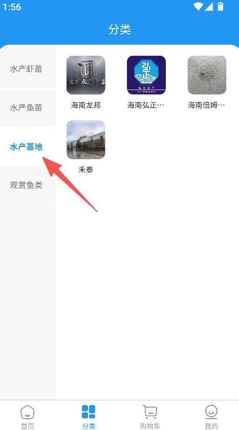 打开软件后,点击分类选项,选择水产相关类别(例如水产基地),即可查看对应的水产资源信息。