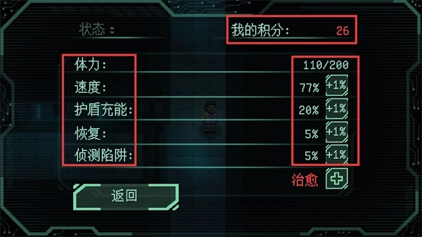 在状态界面消耗积分,即可升级【速度】【护盾充能】等属性,助力角色提升能力,更好地应对后续挑战。