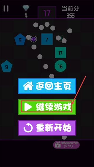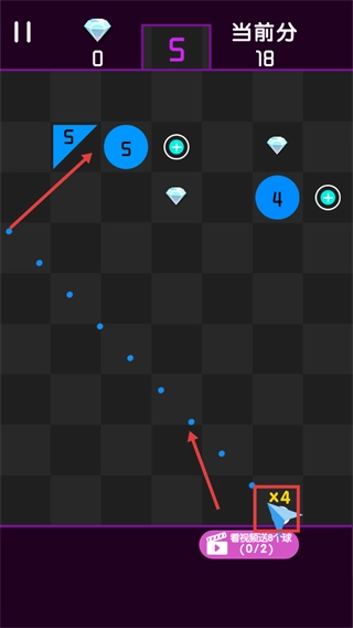 在游玩时,瞄准标有【5】【4】这类数字的方块发射弹珠,可增加【当前分-18】的分数,另外也能借助【看视频送1球】的方式来补充弹珠的数量。