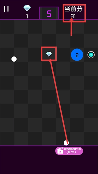 弹射弹珠时,建议优先瞄准界面里的【钻石】道具来获取奖励,再对准【2】方块去累积分数,这样能帮助提升【当前分-31】。
