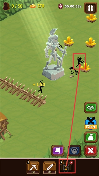 战斗过程中投放耗费200资源的弓箭手单位,保持8/50的兵力数量,另外要注意160的资源收益情况和计时推进进度。