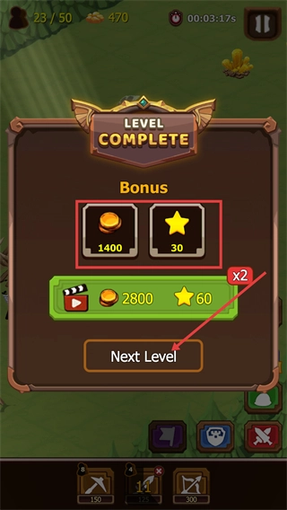 关卡完成后可获得【1400】金币和【30】星星的【Bonus】奖励,点击【Next-Level】即可进入下一关,也能通过观看广告来获取双倍奖励。
