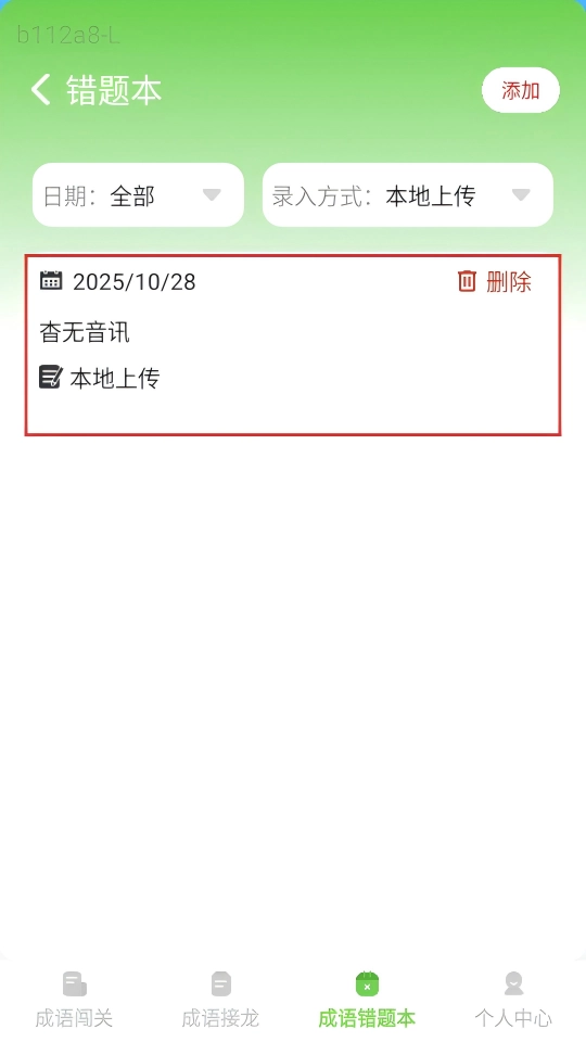 保存操作完成后回到错题本页面,就能看到之前记录下来的错题,这样后续就可以专门针对成语类错题开展复习和巩固工作了。