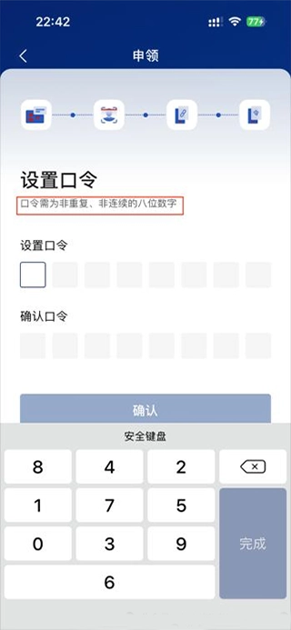 第6步:设置口令,【请务必注意要求是八位数字,且数字不能重复、不能连续】;