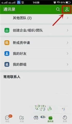 打开手机钉钉并完成登录操作,随后在底部导航栏找到【通讯录】选项,点击其右上角的加号按钮。