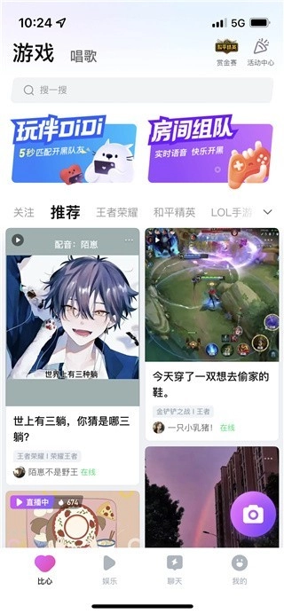 打开比心应用后,在首页就能找到“玩伴DIDI”的入口,点击它仅需5秒即可匹配到开黑队友;此外还有房间组队功能,支持实时语音交流,让你轻松开启欢乐的开黑体验。