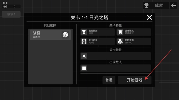 选择关卡后,先了解该关卡的特性以及即将遭遇的敌人,制定好应对策略,再点击“开始游戏”按钮进入关卡。