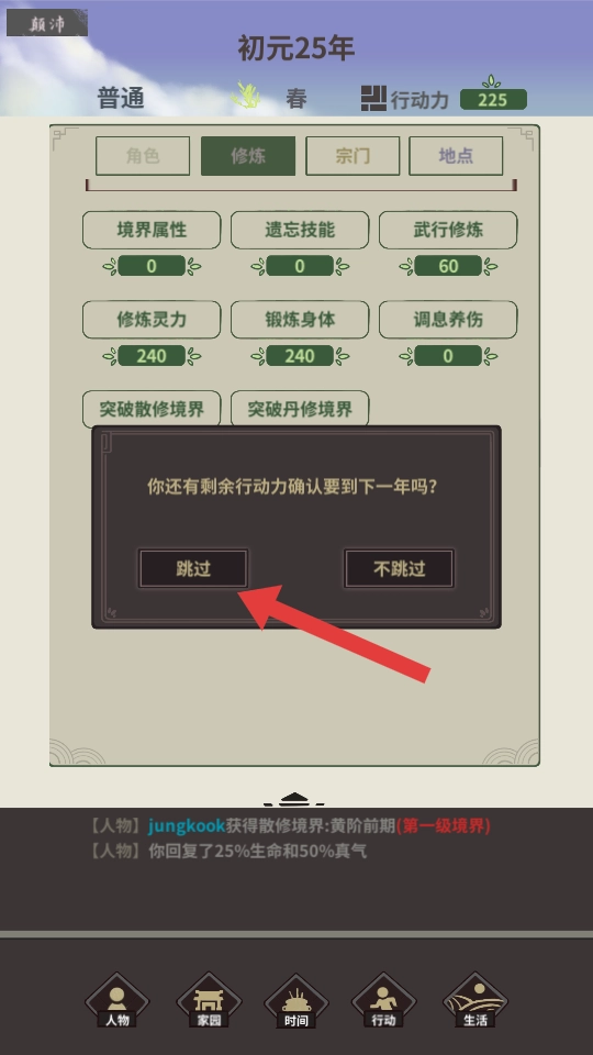 在修炼界面,若还有剩余行动力,玩家可以选择跳过至下一年,以此快速推进游戏时间,开展更多的修炼与冒险活动,进而提升自身境界。