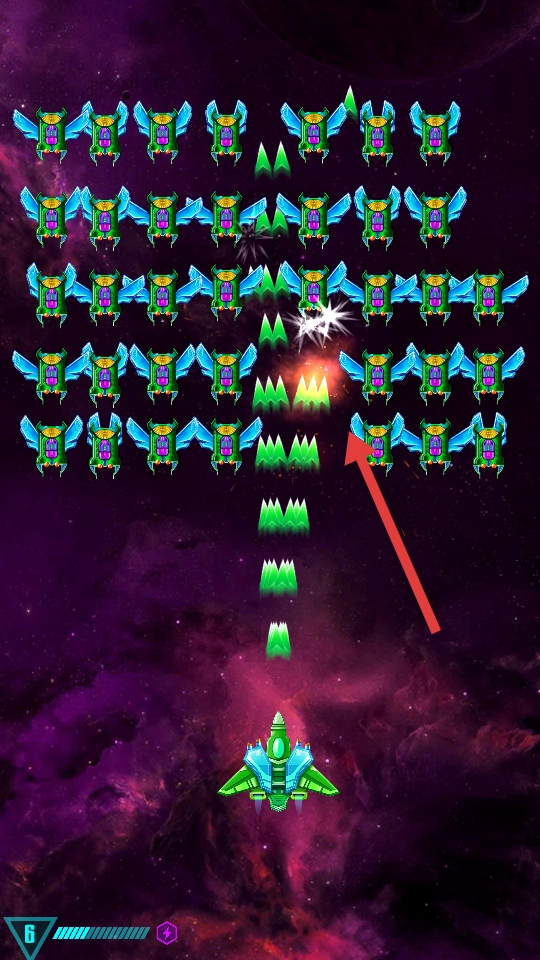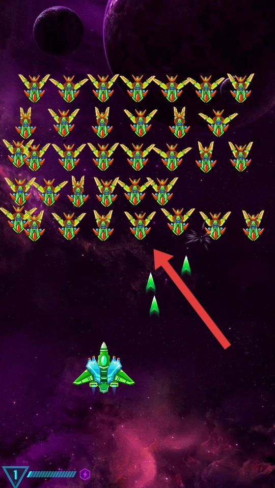 操控自己的战机在敌机群下方左右移动,同时不断发射子弹,优先打击位于边缘或靠前位置的敌机,逐步突破敌机群的阵型。