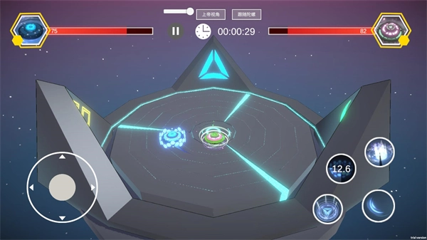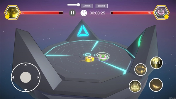 选好陀螺后比赛就正式开始了,发射陀螺后,屏幕左侧可以控制陀螺移动,右侧则是陀螺的技能按钮。