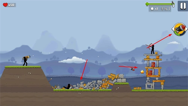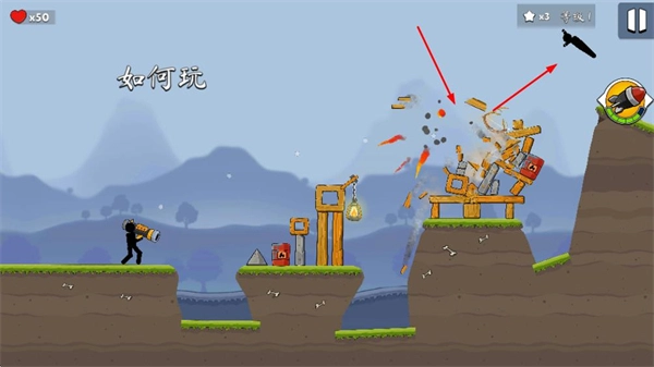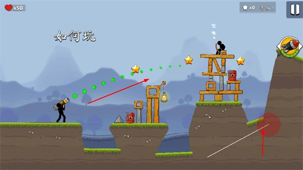 控制火柴人角色,借助武器对准目标,通过调整角度,发射弹药来攻击由木块等搭建的建筑结构。
