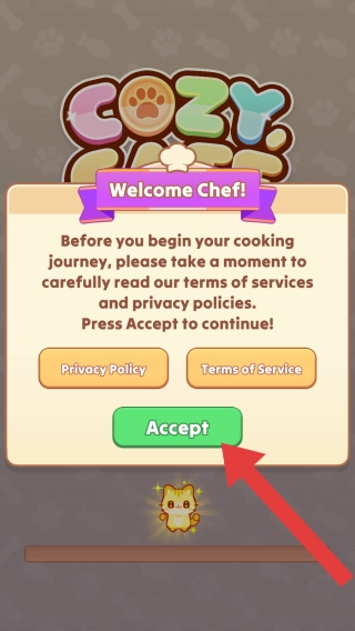 进入烹饪旅程前,需要先查看欢迎语(WelcomeChef!)以及服务条款与隐私政策的提示,点击【Accept】按钮即可开启模拟烹饪经营类的烹饪体验。玩家将在游戏中开启与烹饪相关的体验。