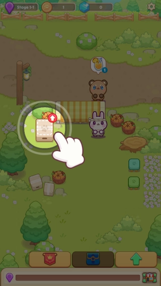 呈现“stage1-1”关卡,有兔子、小熊等角色,还有任务指引(手指点击带红点的界面),属于轻松的经营养成或闯关玩法,玩家可在其中体验经营、互动等内容。