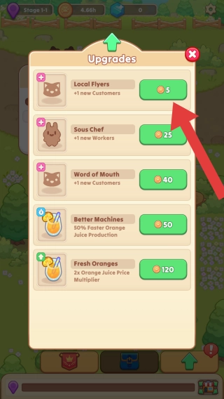“Upgrades”板块涵盖“LocalFlyers”“SousChef”“WordofMouth”“BetterMachines”“FreshOranges(新鲜橙子,橙汁价格翻倍)”等升级项目,这些项目可用于增强经营能力。