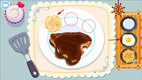 牛排淋上酱汁后,玩家需依据客人的要求,从右侧挑选对应的配餐添加至餐盘之中。