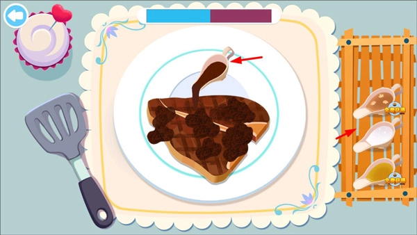 牛排煎制完成后盛入餐盘,点击右侧的酱汁选项,即可为牛排增添风味