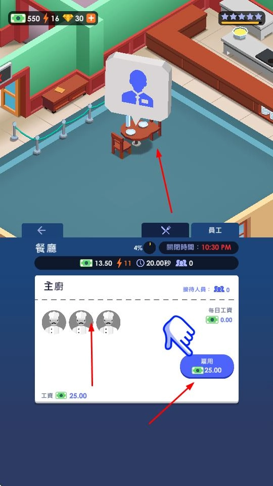 在餐厅区域,你可以花费25.00金钱雇佣主厨等员工,为餐厅配备人员来提供餐饮服务。