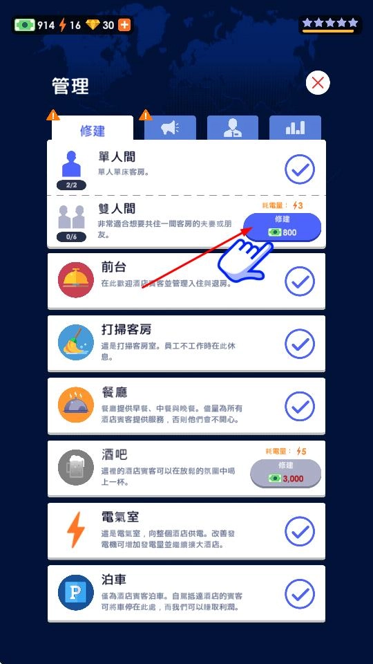 进入管理界面后,可消耗对应金额的金钱来建造单人间、双人间、前台、餐厅等各类酒店设施,从而逐步完善酒店的功能区域。