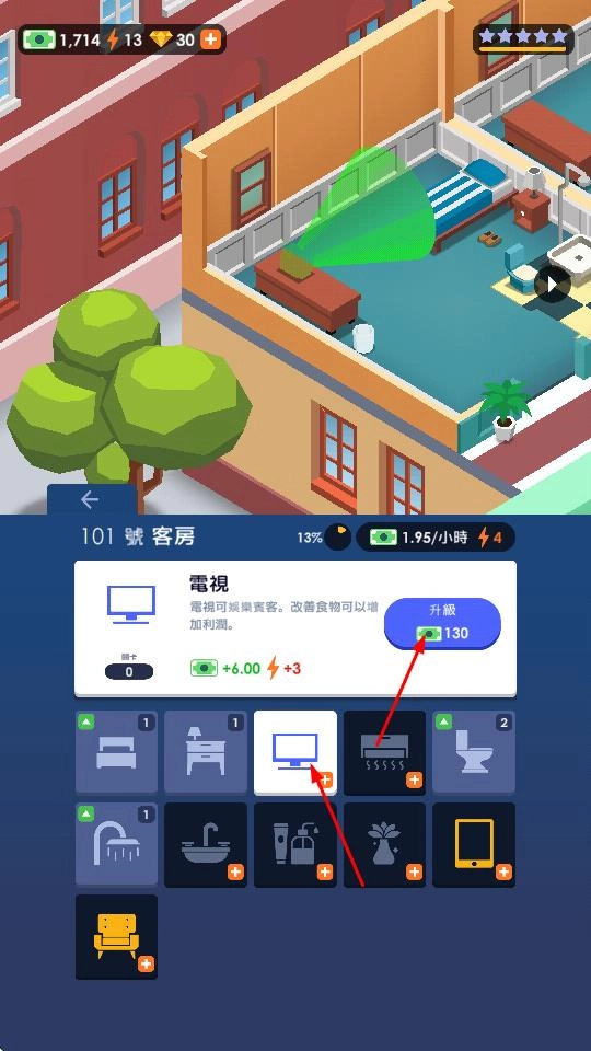 在客房界面,你可以花费130金钱来升级客房里的电视之类的物品,这样能提升客房的品质,进而增加客房的收益。